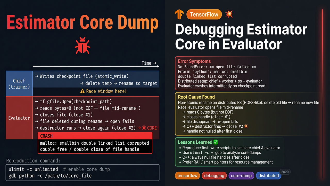 仔细 Review 之前的 code,发现之前在修复 tensorflow 的一个问题时,读到 bytes 为 0,但是文件没有结束时, 会关闭文件,然后重新打开文件。在这个期间如果文件被删除,打开会失败。会走到 File 类的析构函数,在析构 函数中会再次关闭文件,由于第一次关闭文件时并没有置空句柄,导致重复关闭时 core。