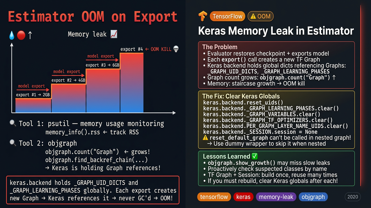 最近用户反馈一个 Estimator 的问题,OOM (out of memory)。由于完全使用的是 Estimator 的逻辑,出错问题 排查了很久。最终使用多个工具找到问题的根源。ps_util 打印内存,objgraph 寻找内存泄露。